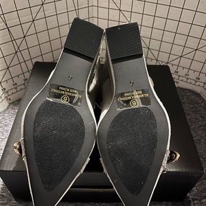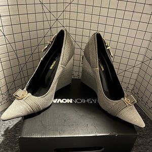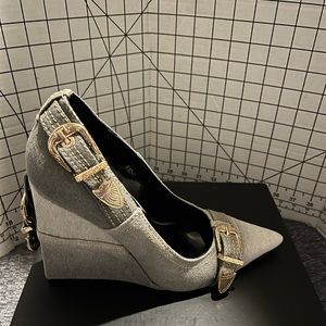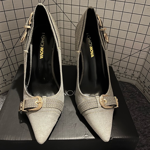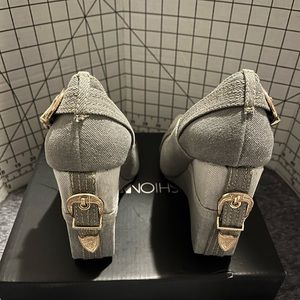 Fashion Nova wedge heels. Grey denim with metallic hardware accents on toe, back and top. New with tag, never worn, only tried on. Excellent condition!