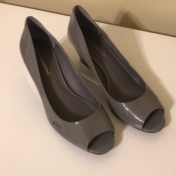Grey patent leather, small wedge, peep toe, great condition other than black scuff near toe.