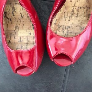 Red patent peep toe wedge. Ware on wedges as shown in photos. 5” wedge in back. 1” in front.