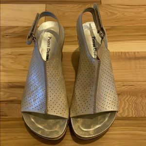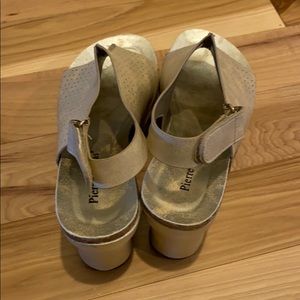 Size 7. Worn once. No wear marks, just slight toe marks. Velcro strap. They are a tan or camel color with just a slight shiner to them!