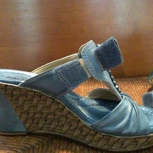 Wedge sandals with a woven-like soul and “Moroccan Blue” leather. They have velcro straps and wooden decorations. They have 3 inch heels.