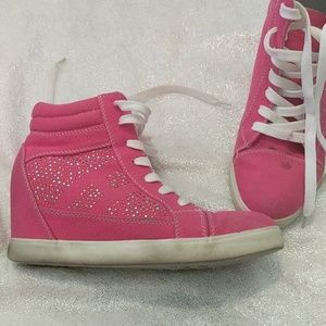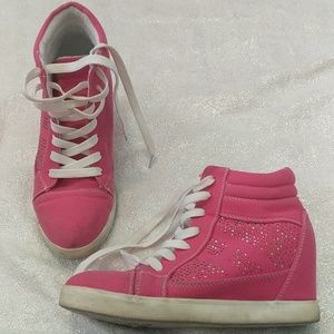 Pink wedge high top booties. Silver, gold, and pink rhinestones on outsides. Tie laces. Need some TLC.