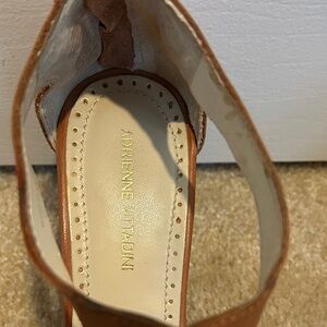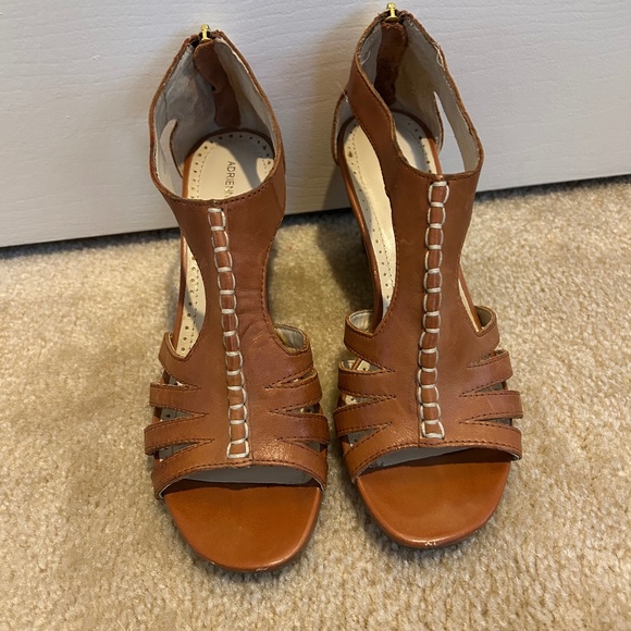 Strappy and sassy! 3" wood look heel. Stitching detail. Zip back.