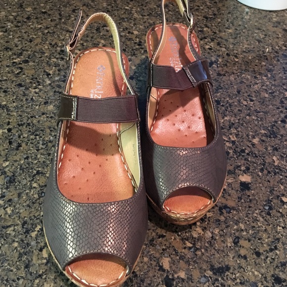 Nice mix of brown patent leather accent with bronze metallic upper. Versatile and comfy. Worn once.