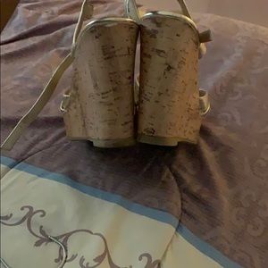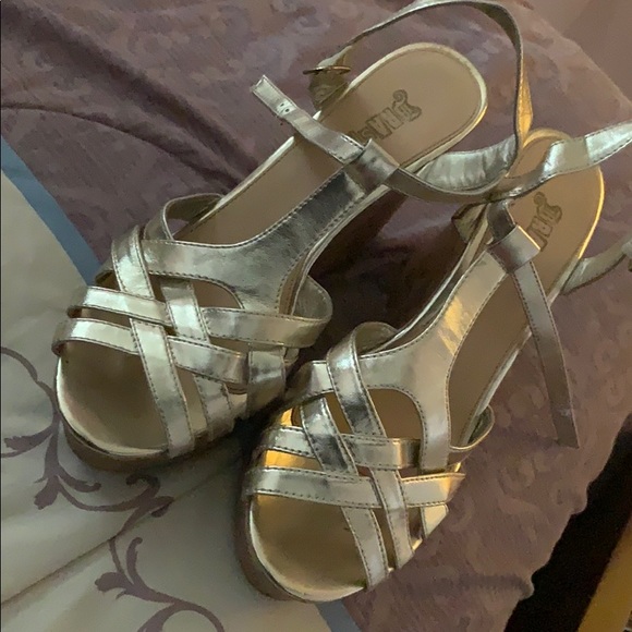 Metallic gold wedge sandals. Cork heel.