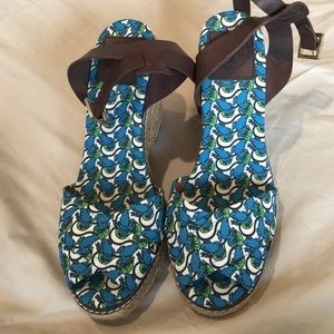 Authentic Tory Burch wedge sandal with a dark brown leather ankle strap. Gold buckle. Lily pad design. Never worn.