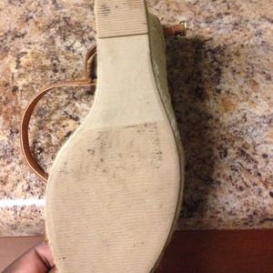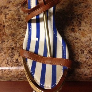 Cute brown with blue and white pin stripped wedges. Perfect with any outfit!!!