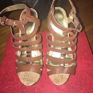 Cognac buckled strap wedges with cork heel, only worn once!