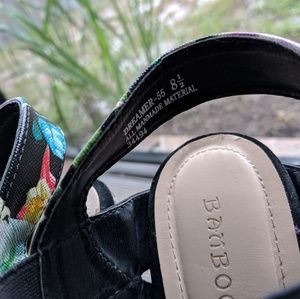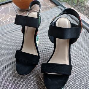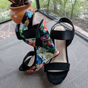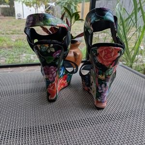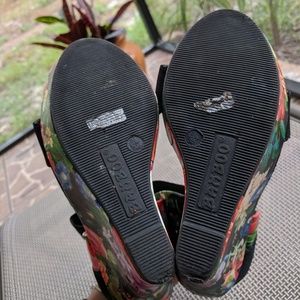 Black and Floral wedges, shows some wear (see pics) but barely noticeable when you're wearing them. Very cute and comfortable shoe!