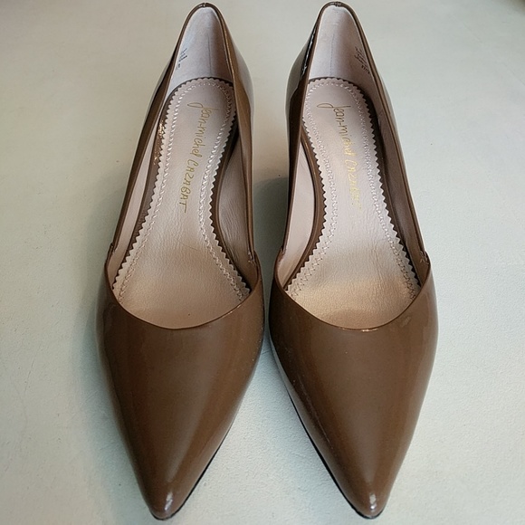 Patent brown, pointed toe. Slight red mark on inside of left shoe.