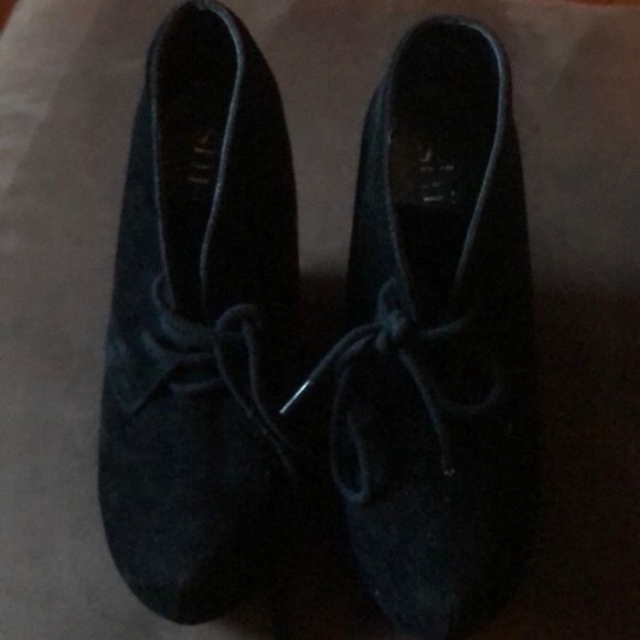 Shi black velvet tie wedges about 4inches have a little bit of wear to them could be cleaned with a velvet cleaner