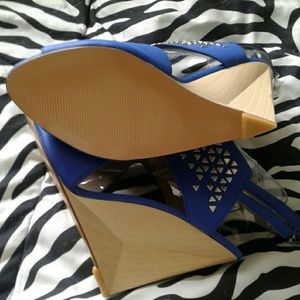 Blue open toe wedge shoes. Size 9.5 but fits a size 8 foot. NEVER WORN!