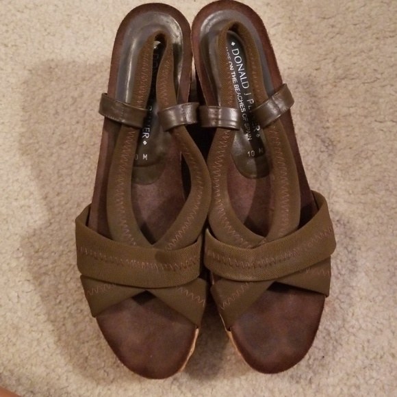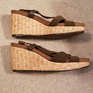 These shoes are brown cloth with an elastic strap. As well with a basket weeved wedge. Slightly worn.