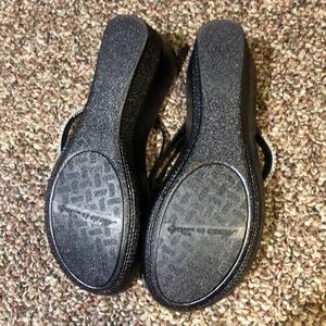 Never worn this open toe shoe is made in Italy and extremely comfortable. From sitting in my closet one of the rhinestones fell off but it is hardly noticeable.