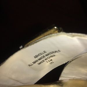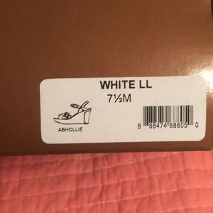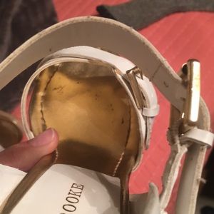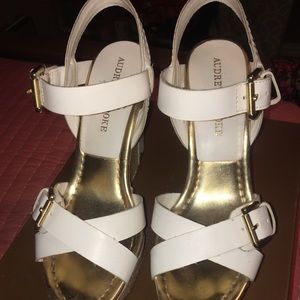 Audrey Brooke wedges. 4-5inch geek. Worn a few times. Selling because I never wear them. Loop on left shoe fell off but I still have it, it can we sewn on. Good condition. Black mark on right and left shoe where the ball of your foot goes. Still have box
