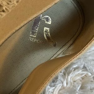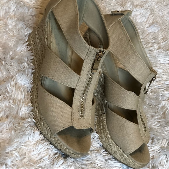 Cute tan wedges! Worn a few times. The flaw is shown in the pictures might be a stain from lipgloss.