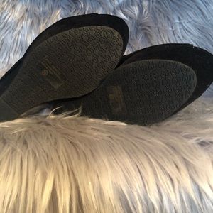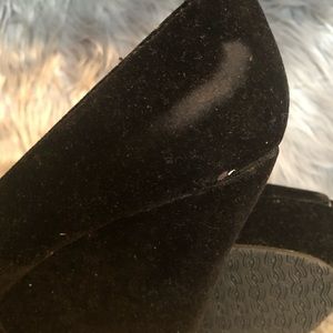 Super high, super sexy black velvet peep toe wedges. Slight wear on one shoe (picture included). These babies need a new home.