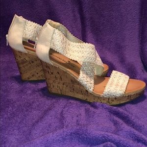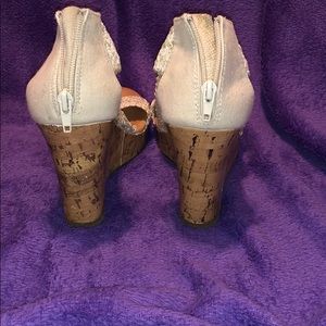These wedges are super comfy and cute. Very easy to walk in for those who have a hard time walking in heels. They are about 3 inches high and in great condition!