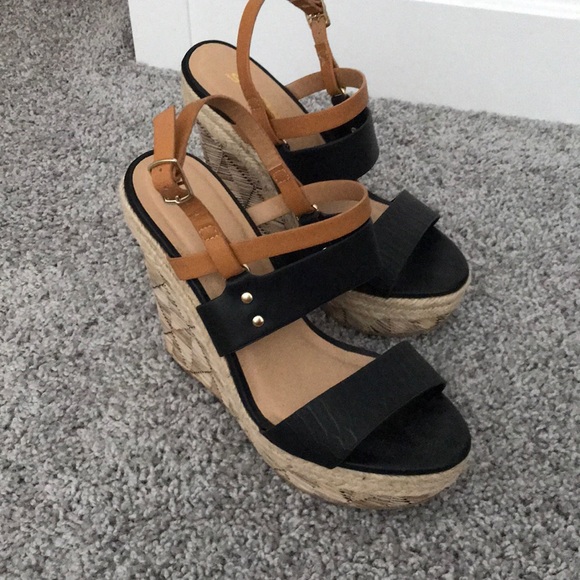 Cute worn once threaded wedge with two black straps and one tan strap.