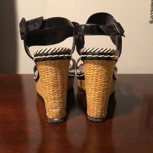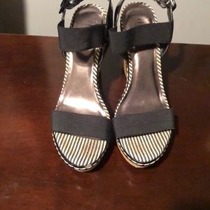 Woven wedge sandal. Black straps with black and white stripped lining