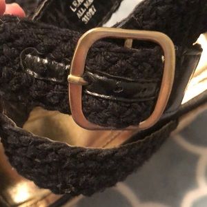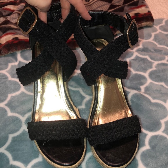 Gently used black wedges. These durable black wedges have an adjustable strap. The bucket has no marks or tarnishing. The buckle around the ankle for good support and strength.