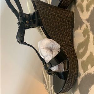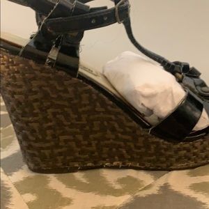 Steve Madden used patent black and weaved bottom wedges. Any wear is shown in photos, some fraying from the weaved bottom.