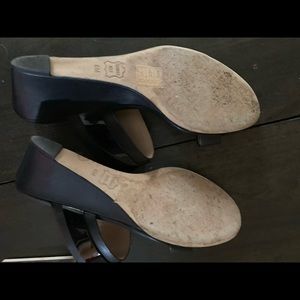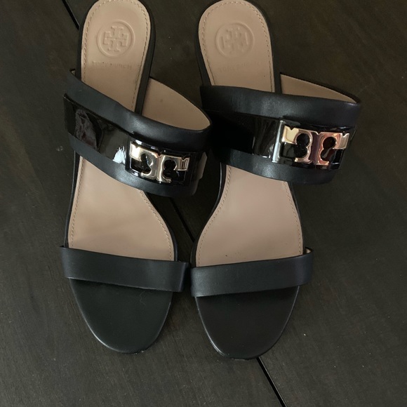 Tory Burch Leather wedges with gold logo. (Worn only a few times 1 small scuff on toe shown in picture)