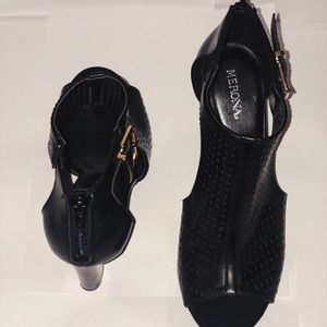 Cute black wedges with a gold buckle on the side. Only worn a few times. Open toed and you are able to zip them on or off from the back.