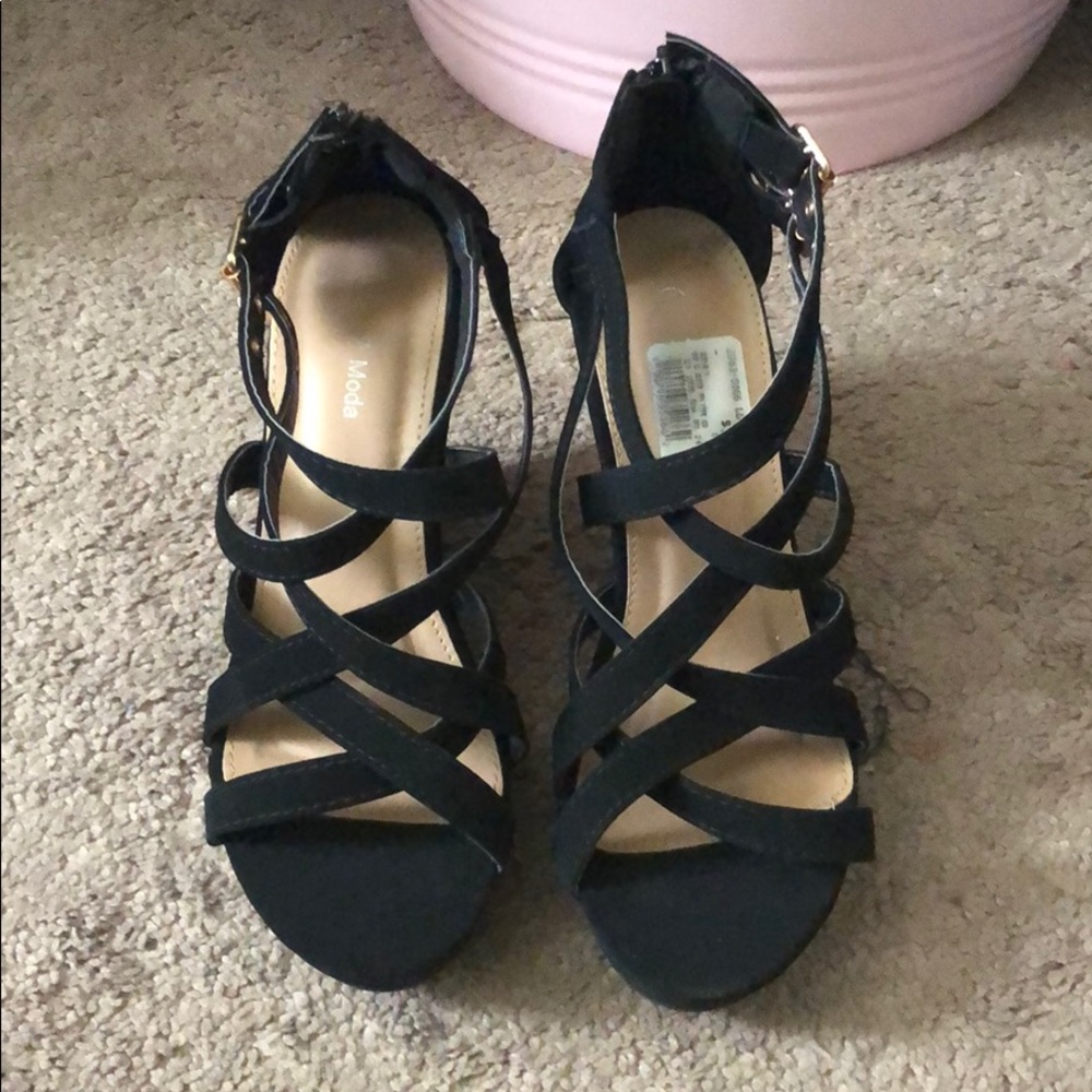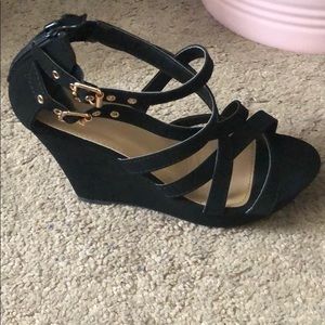 Black wedges with multiple decorative straps and gold buckles