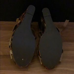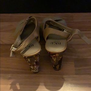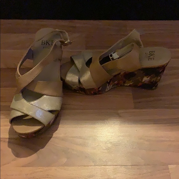 Women’s BKE Sole Wedges. Gold and tan upper and floral on the lower side to front of shoe. Black leather bottom.