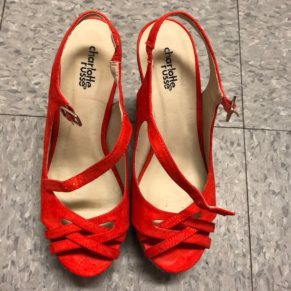 This is a bright coral color almost reddish colored wedge shoe with straw at the bottom.