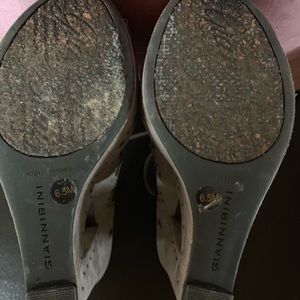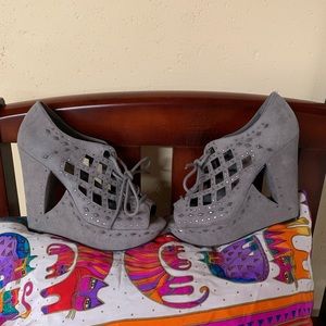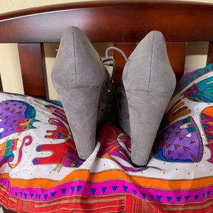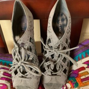 Vince Camuto Grey Swede Laser cut studded wedges . Very comfortable . Great shoes for tradition of seasons with so many outfits . I loved these. Size 6.5