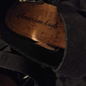 Black strappy wedges with a chunky heel, cork style material for base and thick straps. Better for wide feet
