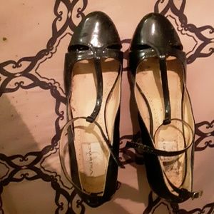 Black T-Strap patent leather wedges.