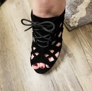 Cute black wedges. Cut outs on sides, open toe and lace up. Super comfortable.