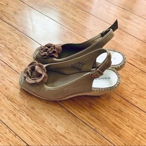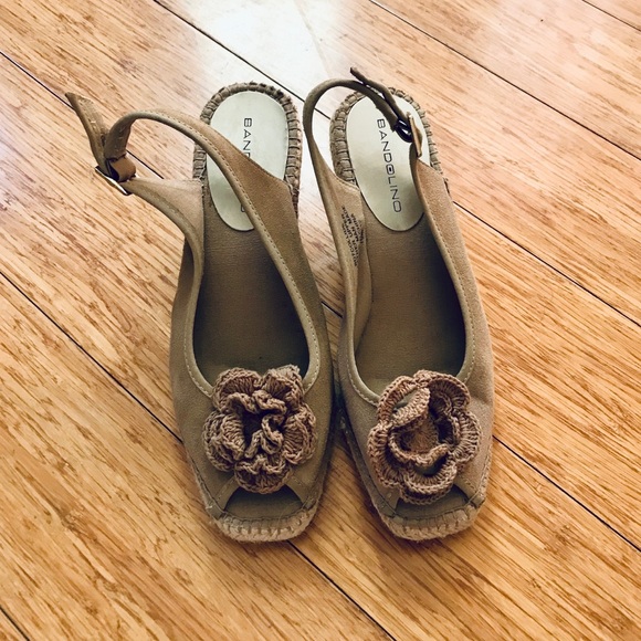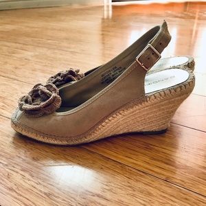 Beige/taupe wedges with adjustable heel strap and crochet floral embellishment