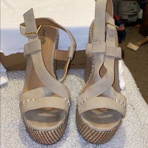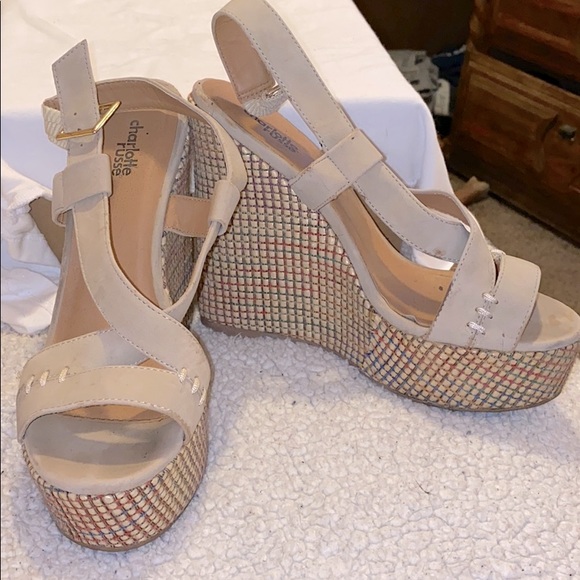 Tan wedges, with coloring in heel. Used. 6” heel.