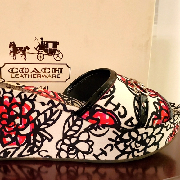 Black and white floral print with a pop of pink and red. Thin black patent strap with Coach emblem. Clear sole. Gently worn.