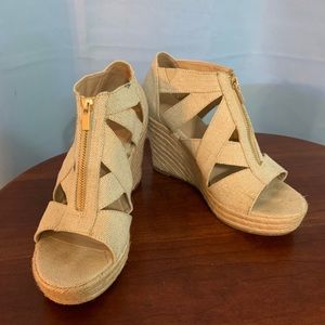 Cream colored wedge sandals. Zip up in front. Subtle gold glitter. Rope detail on wedge.