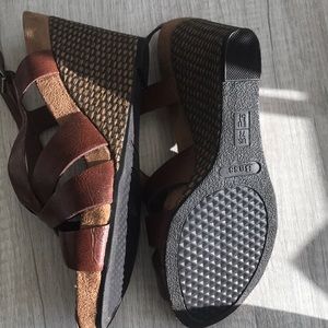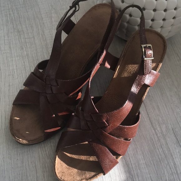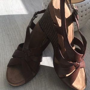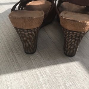 Dark brown wedges Very comfortable, side closure, Excellent condition Man made material 3 3/4in. wedge Size 7.5 Pet & smoke free home!