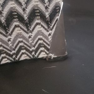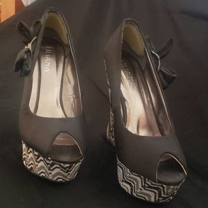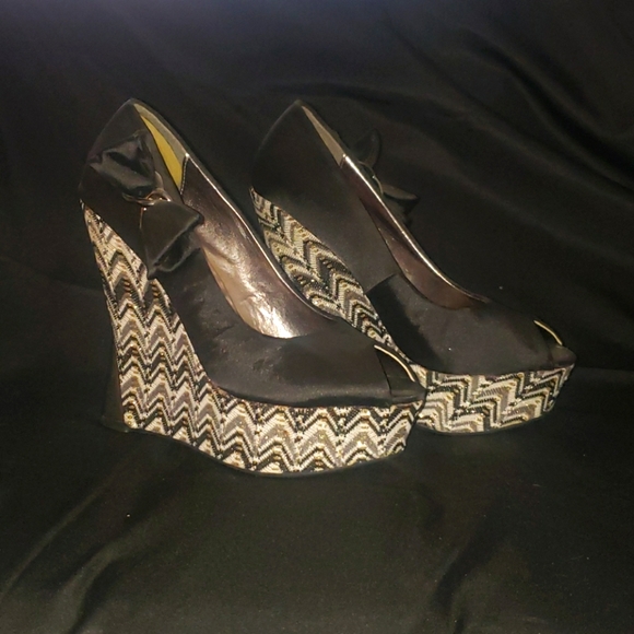 Black and white wedges w bows on the side. Worn twice. The left shoe got attacked by a teething puppy but still cute and functional. Damage shown. Has heel protective cushions inside.