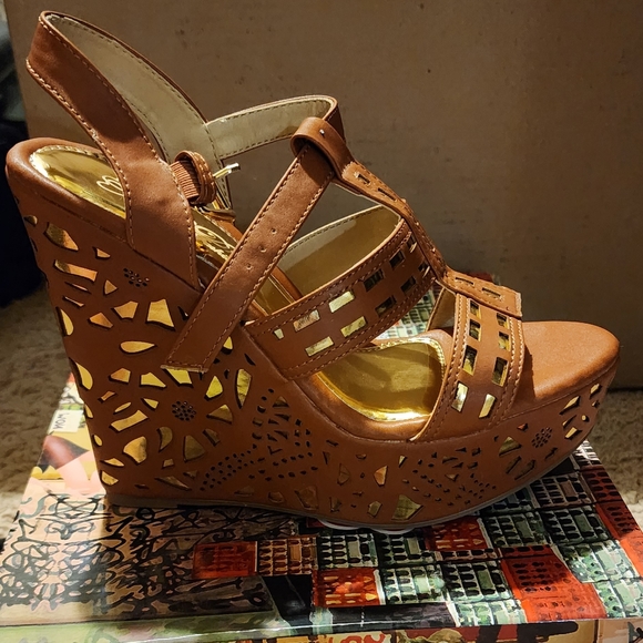 Brand new, Tan with Hold accents on wedge.