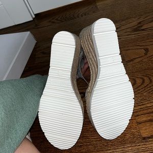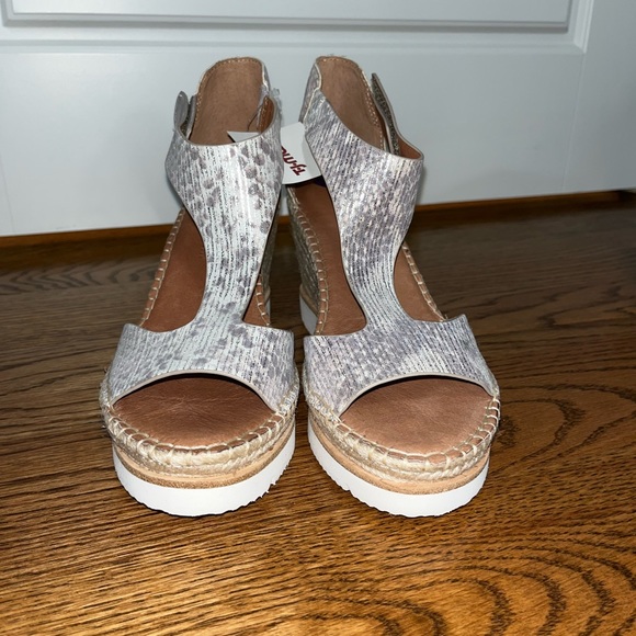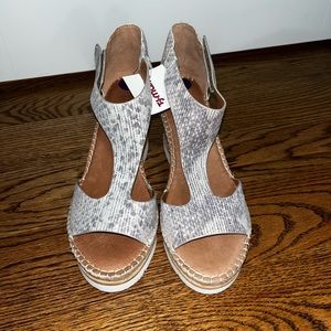 Silver and white snake print wedges