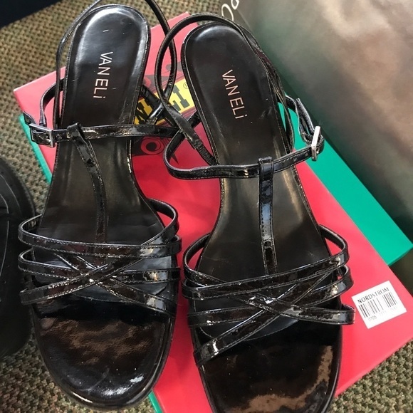 Blk patent leather t strap wedges/ 1.5-2" heels
