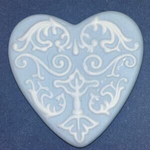 Wedgewood heart-shaped brooch features the classic Wedgwood blue jasperware, known for its delicate, matte finish. The brooch is heart-shaped, with intricate white bas-relief designs that are a hallmark of Wedgwood