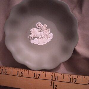 Unglazed stoneware Matte finish Scalloped edge and a white bas-relief design in the center England