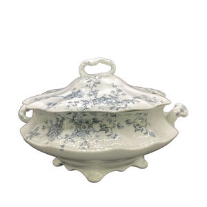 Wedgewood Celia Gray Black Round Scalloped Footed Soup Tureen (Item K25) This soup tureen has beautiful features that make it such an eye pleasing shape. It has a pedestal base with scalloped feet. The lid also has a scalloped edge. Although the pattern is called "Celia Gray Black," the color reads more of a soft gray-blue. There is no ladle and there are 3 tiny flea bites on the edge of the tureen under the lid (see the last 3 photos). I did not find any other flaws. The approximate measurements are: 7" high including lid and handle 4" high with lid off 9.25" widest point of lid 9" widest part of tureen interior Tureen is 10.5" wide including side handles Thanks for visiting my closet!