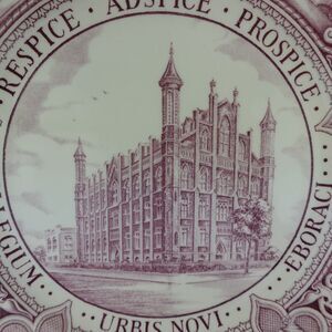 This is a vintage Wedgewood Mulberry Plate featuring the College of The City of New York's The Old Building from 1942. This collectible piece captures a significant moment in the history of the college, making it a unique and valuable item for collectors interested in educational institutions and historical memorabilia. The plate serves as a tangible reminder of the college's past and can be a cherished piece for alumni or history enthusiasts.