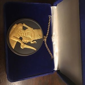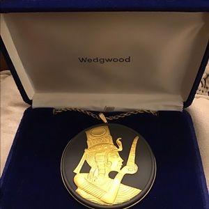 This vintage piece was made in the 70's. The focal image is Queen Ankhesenamun, King Tut's wife in gold tone on the charcoal Wedgewood porcelain medallion. 14k gold plated setting. In original box. Collectible.