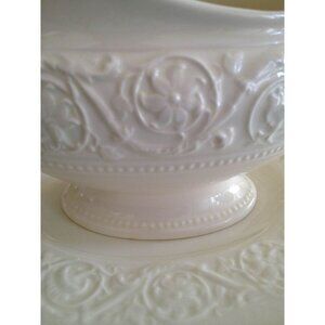 This is a beautiful gravy boat from Wedgwood in the Patrician pattern in ivory, made at the Etruria & Barlaston factories, England. It is in excellent condition, measures 5.5" at the highest part (spout), boat is 7.5" from spout to handle end and base is 9.5"x 6.75".